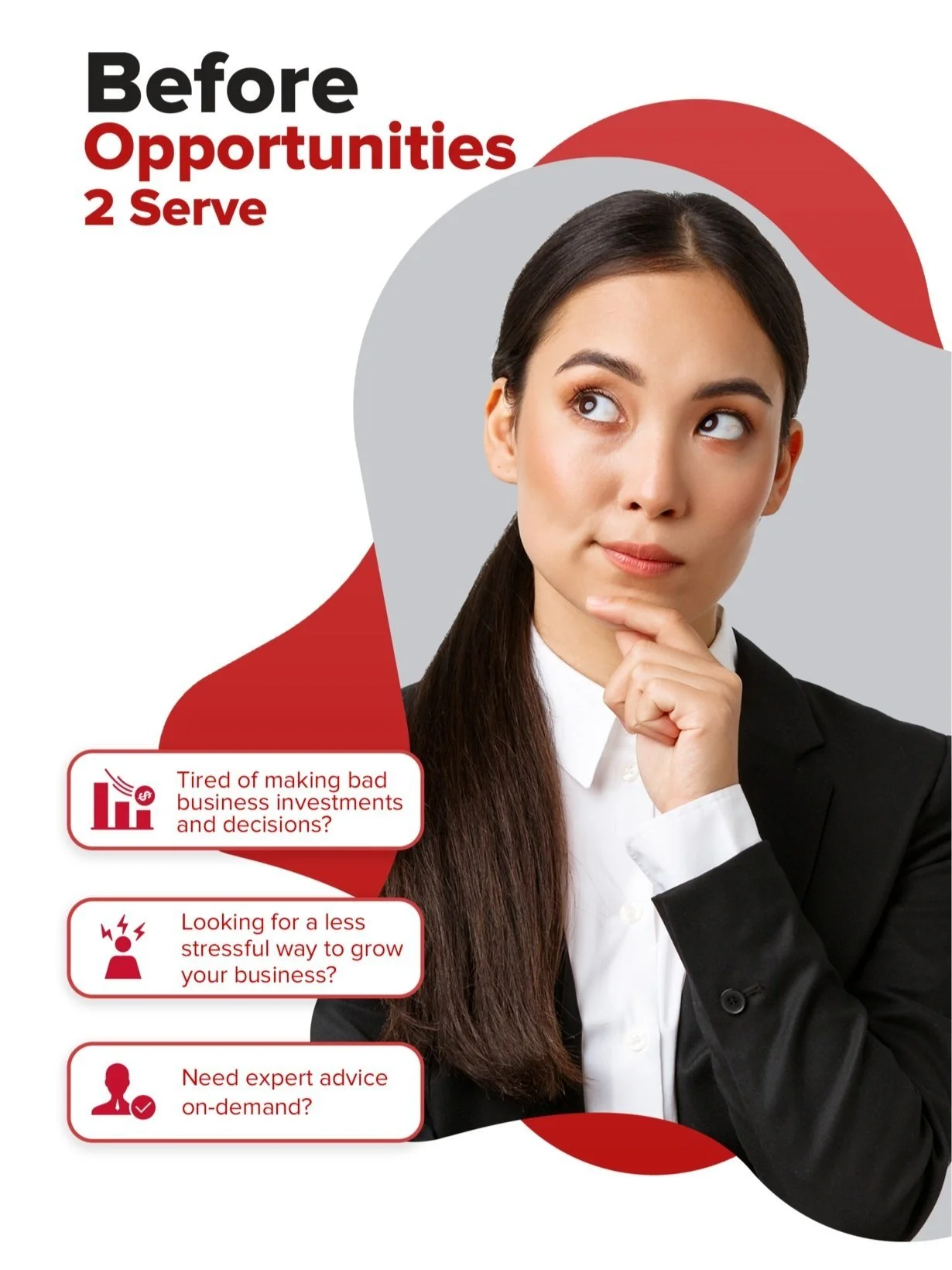 Before Opportunities 2 Serve, entrepreneurs, business owners, decision makers, and the like were forced to complete steps 1–5 by themselves or without the assistance of experts. We can take that fact into consideration when we assume that most business decisions do not lead to an optimal return on investment. Well, that nightmare is over! When you work with Opportunities 2 Serve, you’re only on the hook for numbers 1 and 5… and scheduling your complimentary consulting call, of course. We take care of the rest for you!
